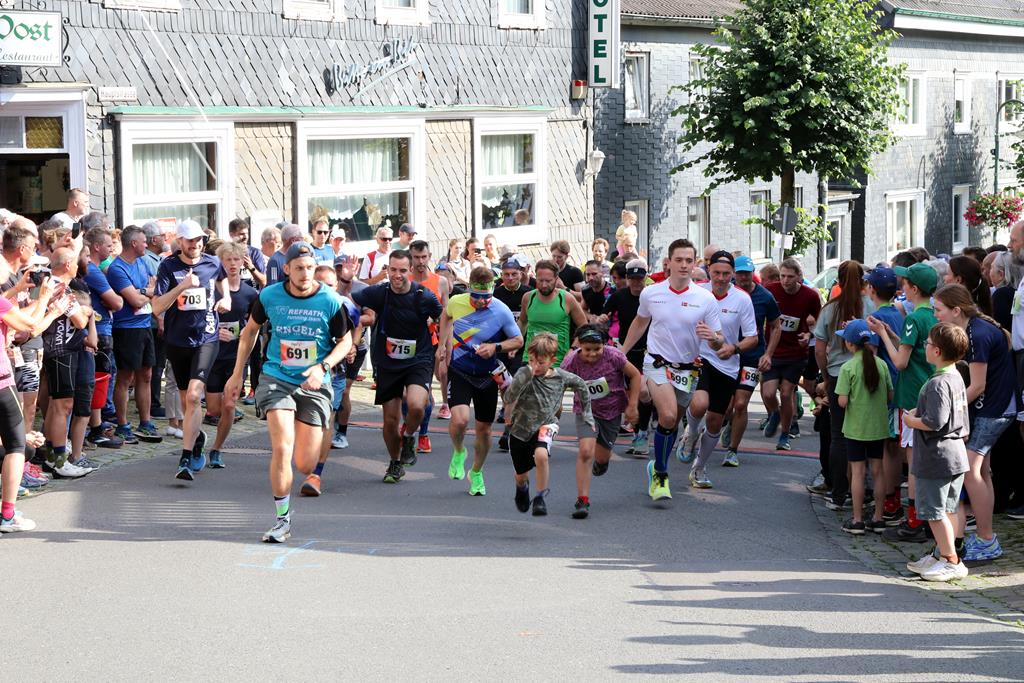 Nach Eröffnung der Veranstaltung durch Daniel Schmitz und den geistlichen Impuls des CVJM Sekretärs Markus Rapsch sowie den Grußworten von Caroline Bosbach und dem stellvertretenden Bürgermeister Stefan Leßenich konnte es endlich losgehen: Die Bambinis gingen an den Start auf die 1,5 km lange Dorfrunde. Diese Disziplin wurde neu eingeführt und fand bei den Kleinen, auch begleitet von Eltern und Großeltern, großen Anklang. Danach ging es Schlag auf Schlag: Nach dem 3km-Lauf, der zwei Mal durch das Dorf führte, wurden dann in kurzen Abständen auch die Läuferinnen und Läufer des Halbmarathons sowie der 6 km und 10 km auf die Strecken geschickt. Mit den 6 km-Läufern starteten auch die Walkerinnen und Walker, die schnellen Schrittes losmarschierten.