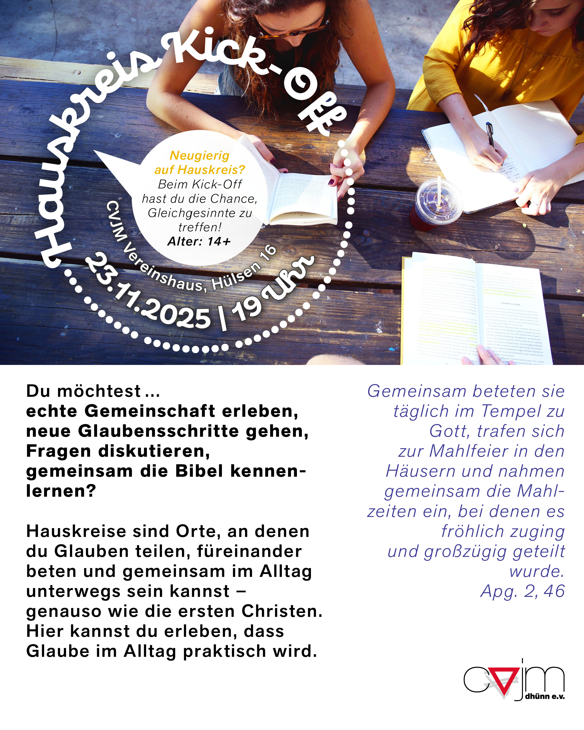 CVJM steht für Christlicher Verein Junger Menschen. Wir bieten ein großes Angebot an verschiedenen Gruppen an ─ von Kinder und Jugend über Musik bis zu Sport. Dabei haben wir immer viel Gemeinschaft und Spaß. Dennoch vergessen wir nie unseren Mittelpunkt: Jesus. Auf unserer Webseite findest du alle Infos zu diesen Gruppen und weitere aktuelle Termine.